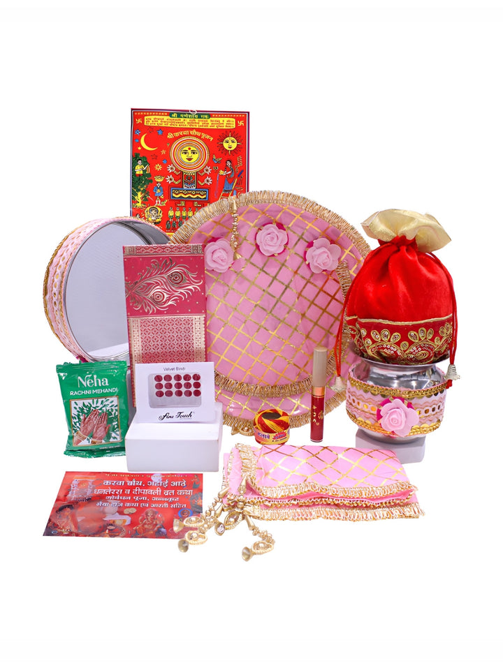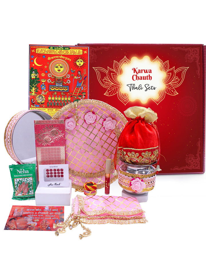 Type: 1 Karwachauth Pure Stainless Steel Heavy Thali with 1 Cover, 1 Lota, 1 Channi, 1 Hanging Poster, 1 (Katha) Book, 1 sindoor, 1 Bindi Pack, 1 Henna Mahendi, 1 Moli, 1 Envelope, 1 Thali cover, 1 Potli Bag