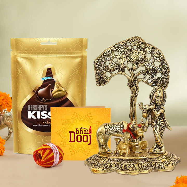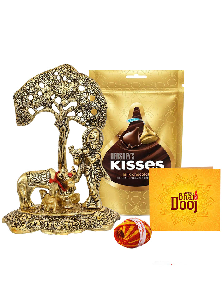 Bhaidooj gift set Contains : 1 Metal Krishna Idol Statue + 1 Hershey's Kisses Chocolate + 1 Greeting card + 1 Kalawa and Roli ChawalAn ideal gift for your brother on Bhai Dooj