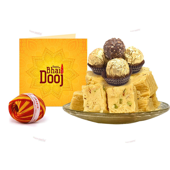 Bhaidooj gift set Contains : 1 Ferrero Rocher Chocolate (4 pcs) + 1 Greeting card + 1 Soan Papdi (250 gm) + 1 Moli + Roli ChawalAn ideal gift for your brother on Bhai Dooj