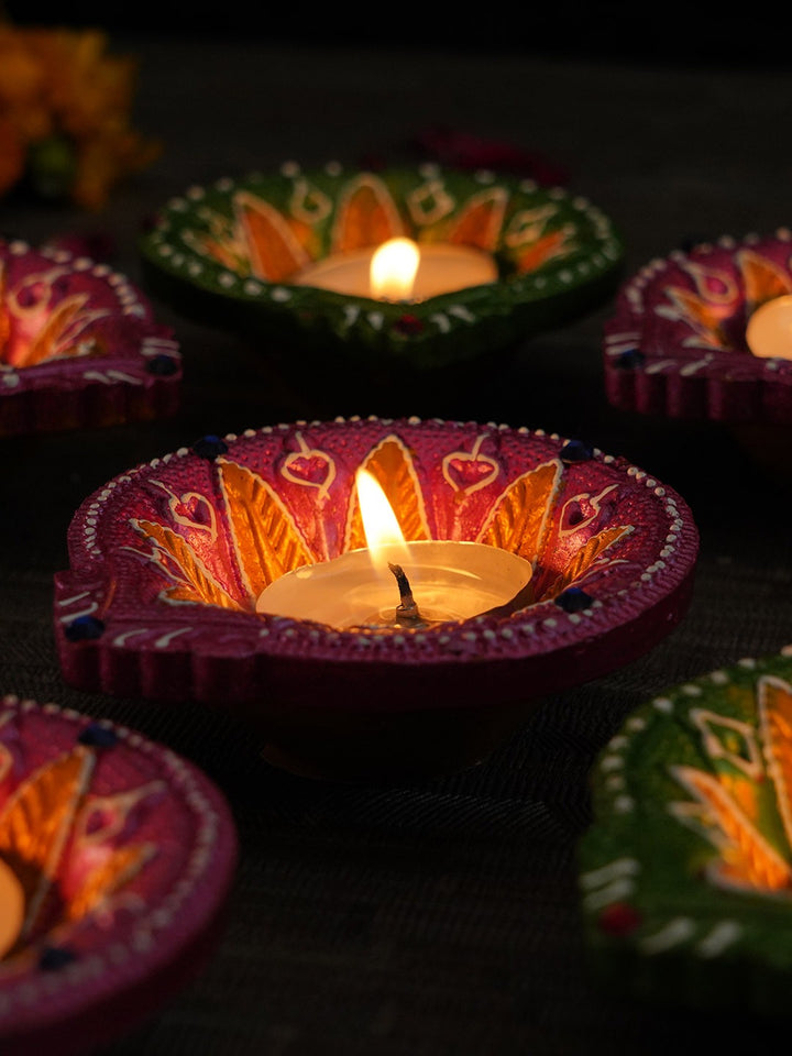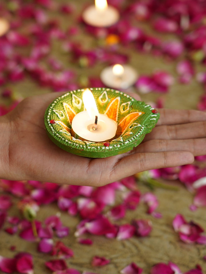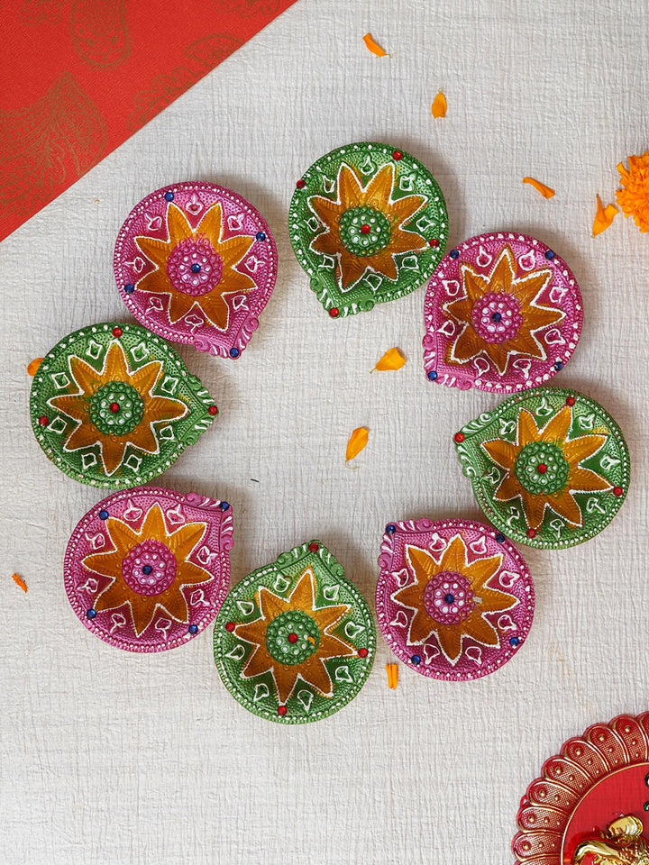 Green and pink set of 8 terracotta clay diwali diyasSize & Fit
