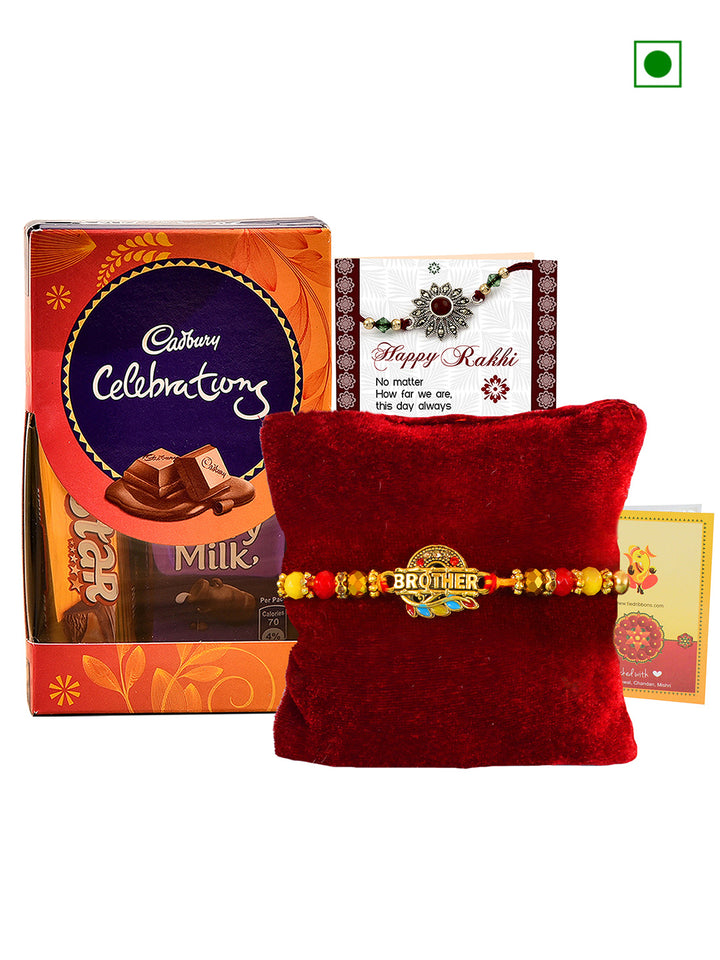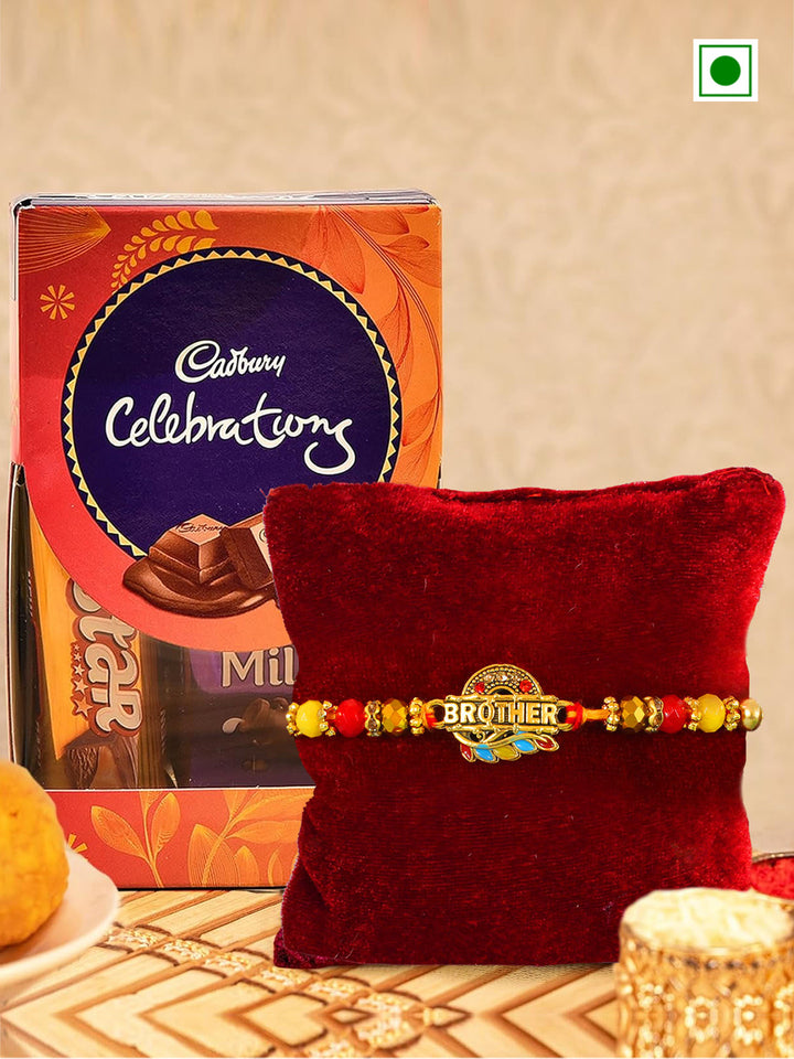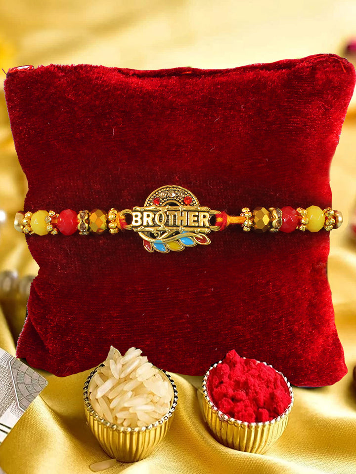 Red & Yellow color rakhi, has charm details, secured with tie up closure