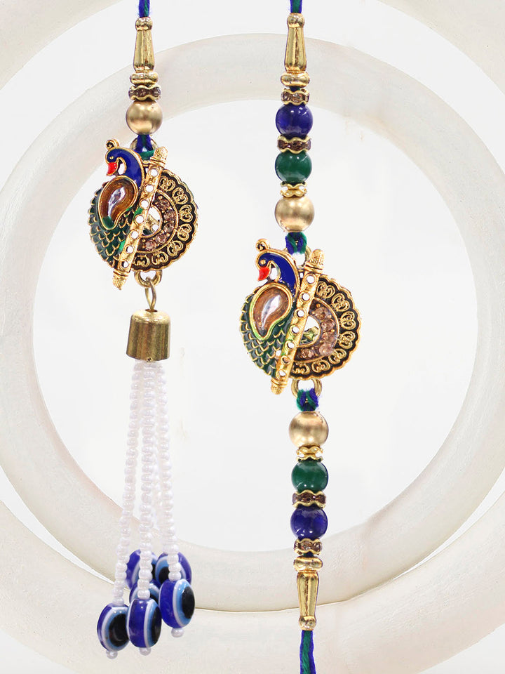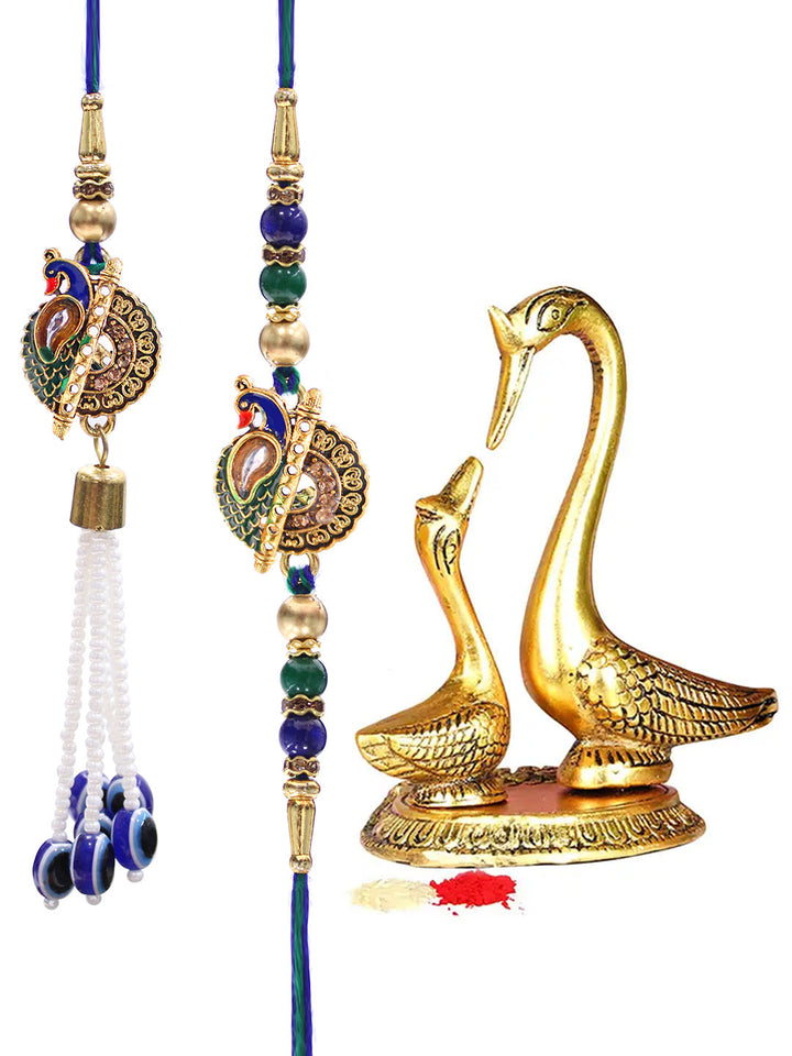 Rakhi for Brother and Bhabhi with Gift Set Swan Statue and Rakhi CardRakshabandhan gift box: Sacrosanct. Handcrafted. The box contain: 1 Brother rakhi (Bhaiya) + 1 Bhabhi Lumba + Swan Statue (Metal Figurine) + 1 Raksha bandhan greeting card + 1 Roli chawal tika chandan pack.