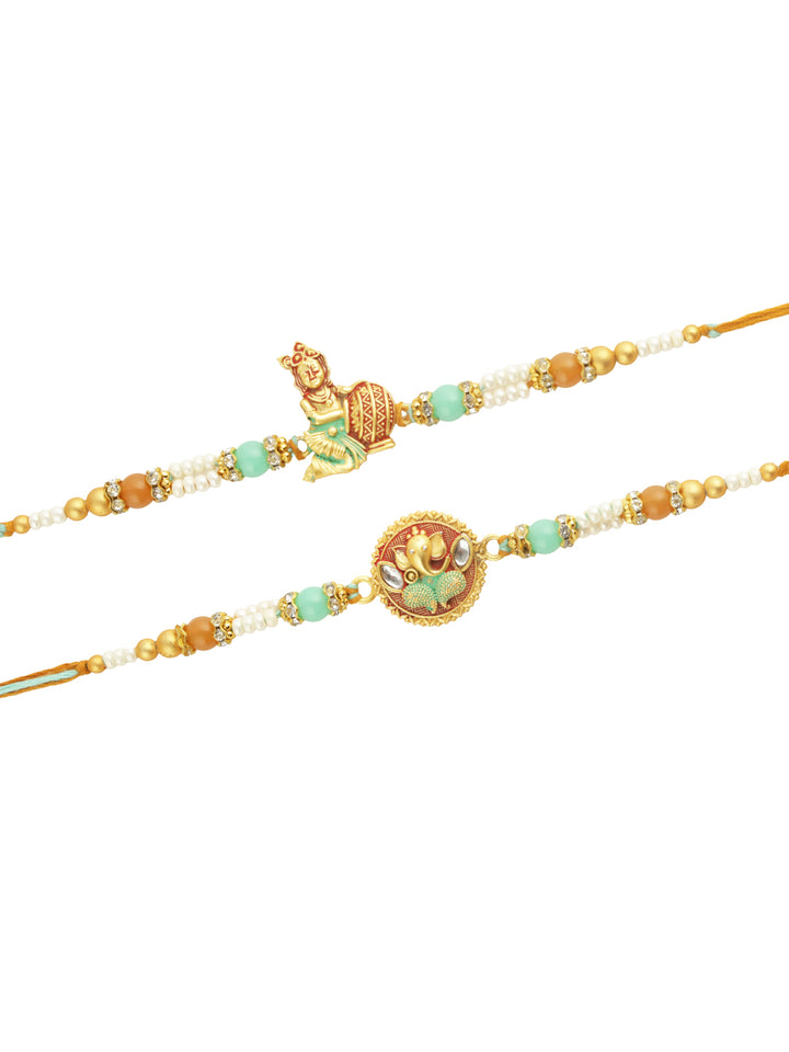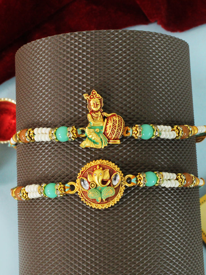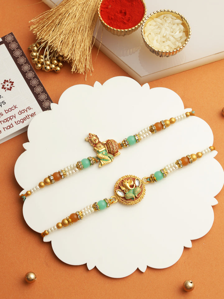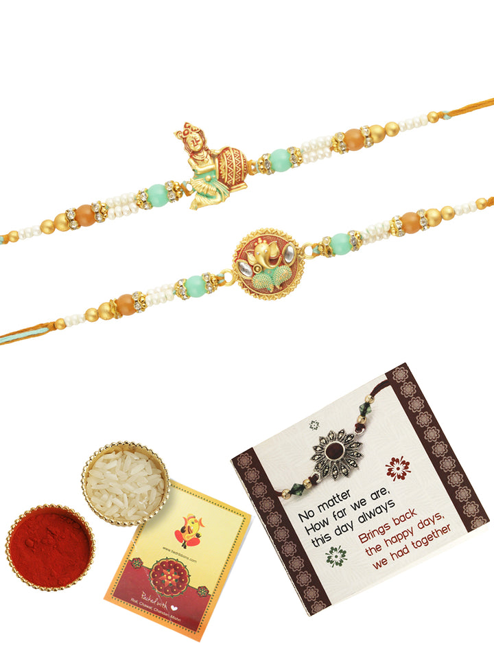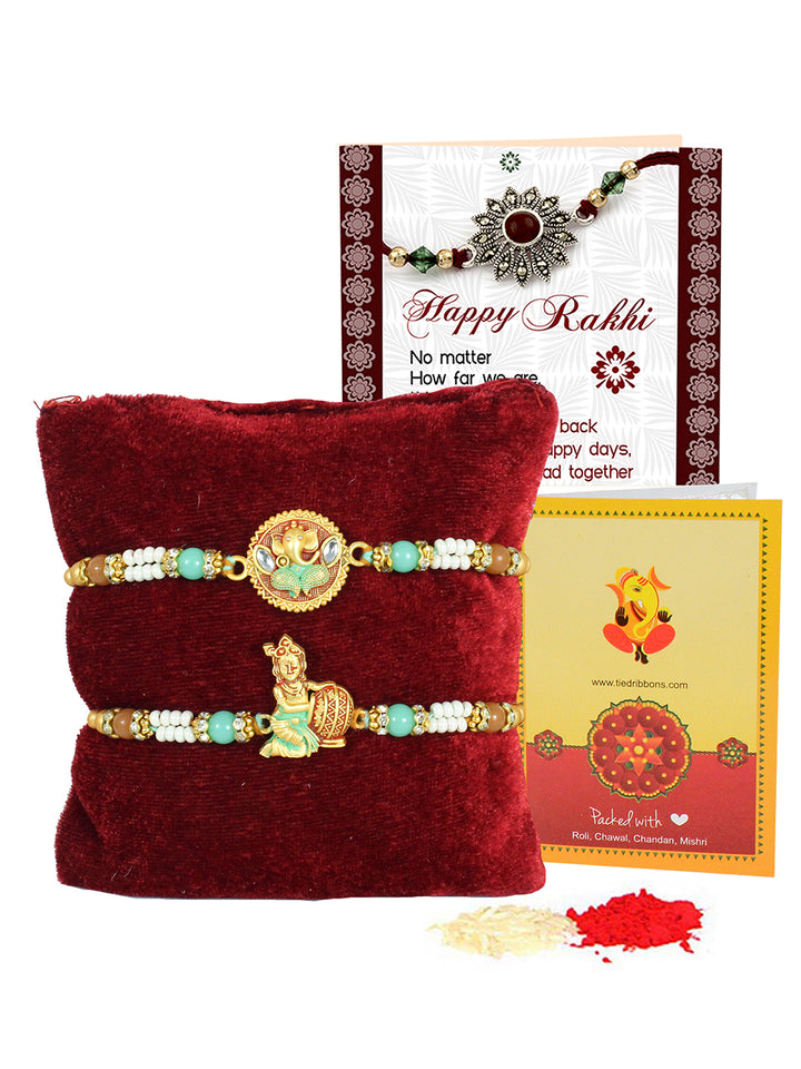 Set of 2 Rakhi for Brother with Gift Set Rakhi for Bhaiya with Mini Card and Roli Chawal PacketRakshabandhan gift box: Sacrosanct. Handcrafted. The box contain: 2 Brother rakhi (Bhaiya) + 1 Rakhi card + 1 Roli chawal tika chandan pack + 1 Organza potli bag.