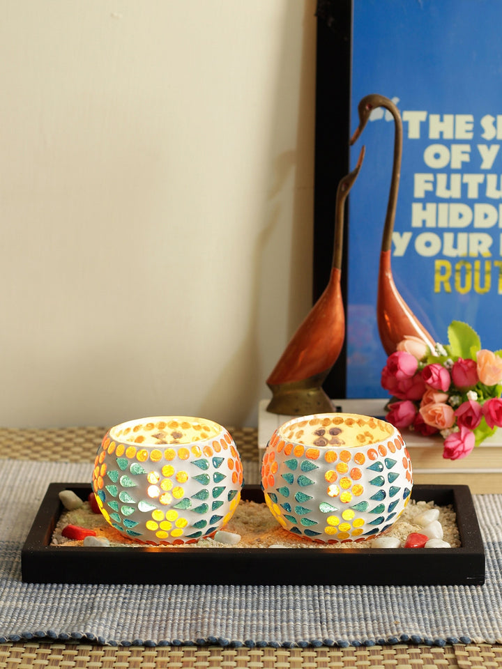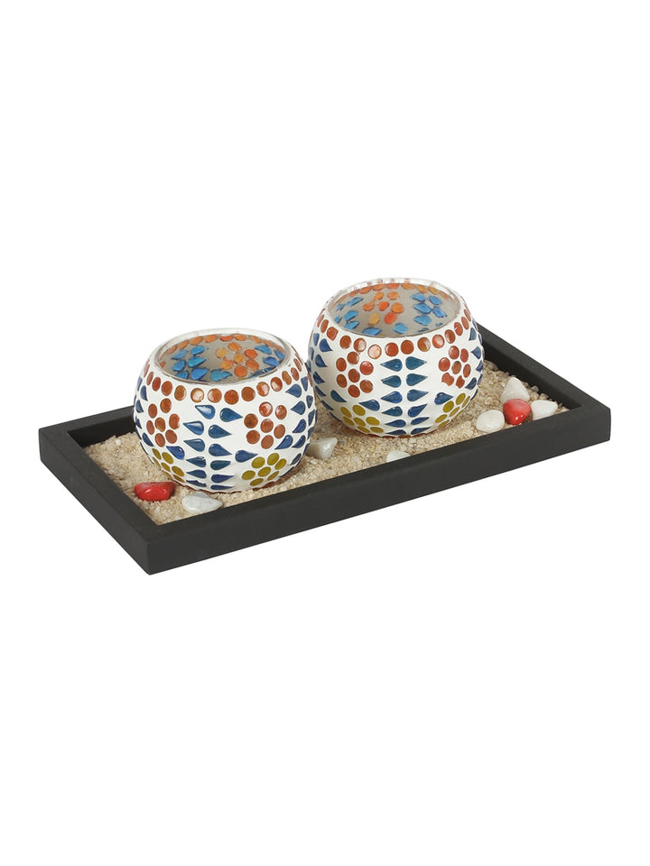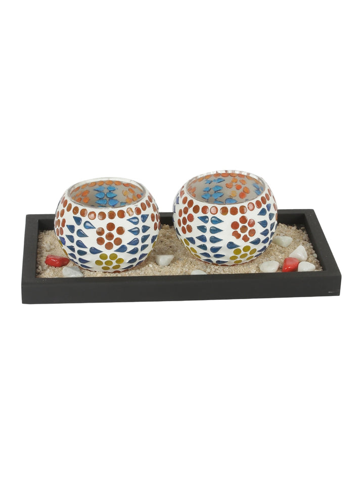 Set Content: 2 candle holders with trayColour: White, brown and blue