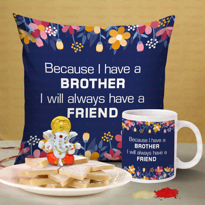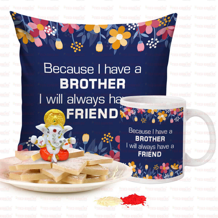 Special Gift Cushion, Mug , Ganesha Idol & Sweets Combo For Brother with Kalawa and Roli Chawal