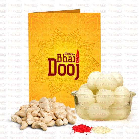 The Package Contains: Cashews (100 grms) , Rasgulla Tin Pack (500 Grms. ) ,Greeting Card ,Kalawa, Roli ChawalAn ideal gift for your brother on Bhai Dooj